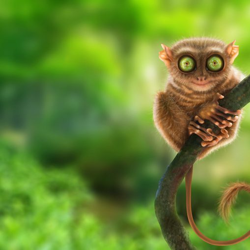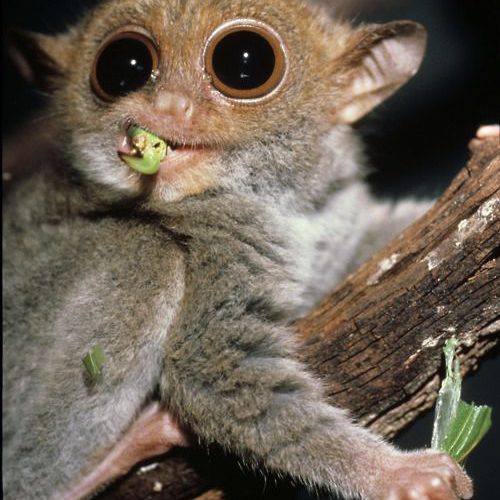 Leurs yeux sont réellement immenses et chez les espèces les plus spécialisés, les orbites sont si démesurées que la tête est effectivement que haut. Les tarsiers vivent en couple et se nourrissent d’insectes, de lézards et d’autres petits vertébrés. On les voit rarement, bien qu’ils soient pas rares, surtout dans les forêts secondaires. Leurs noms indonésiens en dit long sur leurs modes de vie et leurs personnalités : binatang hantu – l’animal fantôme.